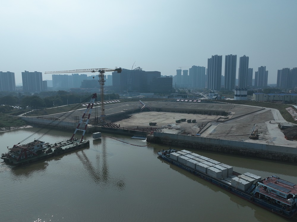 南岸段纵向布置上下两层减载沉箱,上层布置9排,下层布置11排,共计布置20排,每一排横向布置15个,共计布置减载沉箱300个;北岸段纵向布置上下两层减载沉箱,上层布置3排,下层布置5排,共计布置8排,每一排横向布置15个,共计布置减载沉箱120个已全部完成,南岸段沉箱预计春节前全部完成安装。