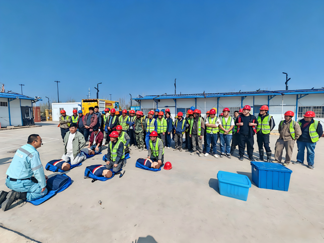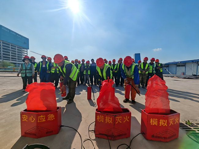 培训现场,讲师带领工友依次开展模拟火灾场景演练、触电急救、心肺复苏、灭火实操、伤口包扎、海姆立克急救法等实战训练,每项操作均设刚性标准:心肺复苏须严格达到规定按压深度与频率;灭火器实操必须遵循“提、拔、握、压”四字口诀,对准火源根部左右扫射。参训工友在反复操练中切实掌握了隐患识别、防范及应急处置方法。