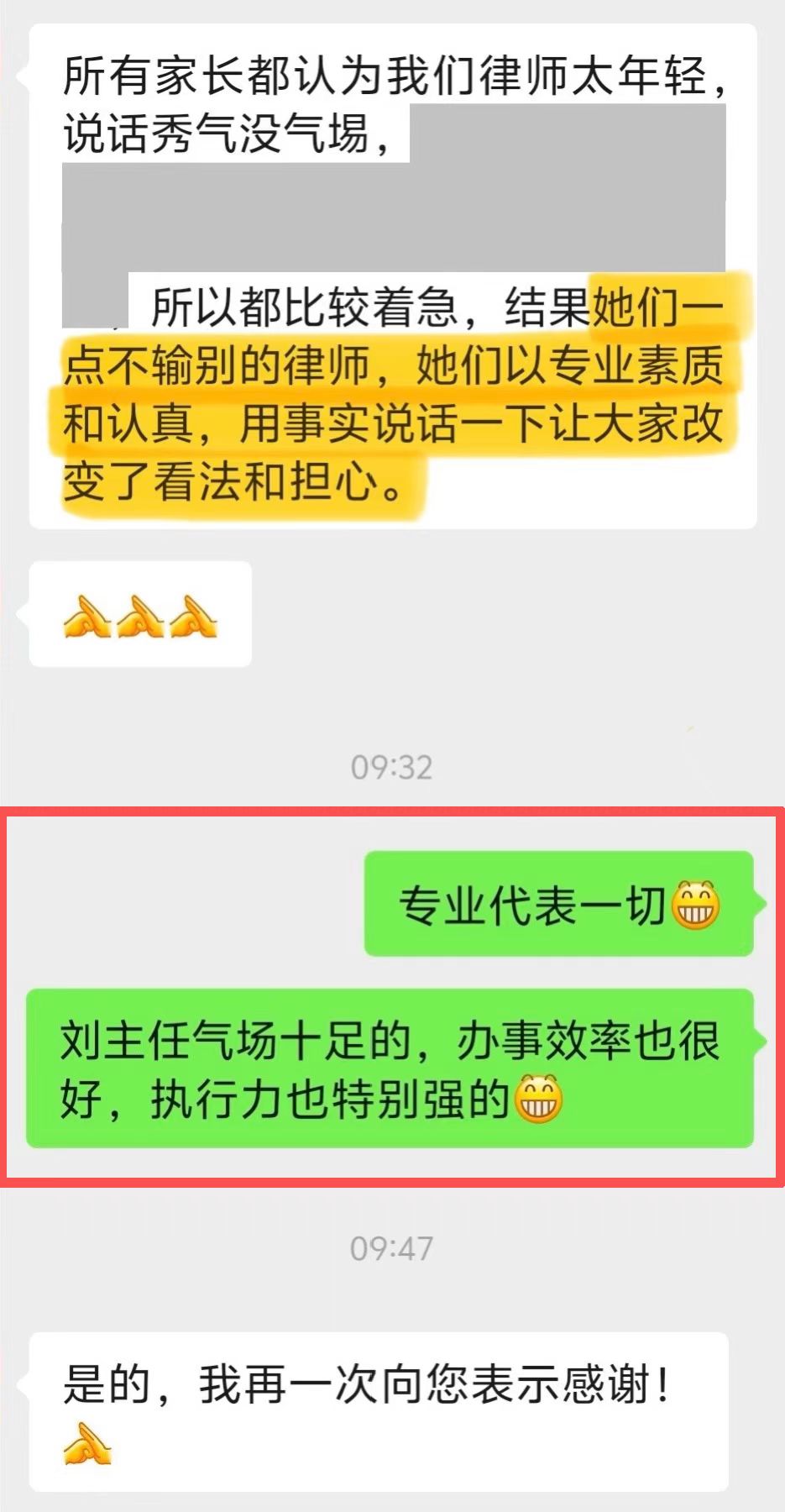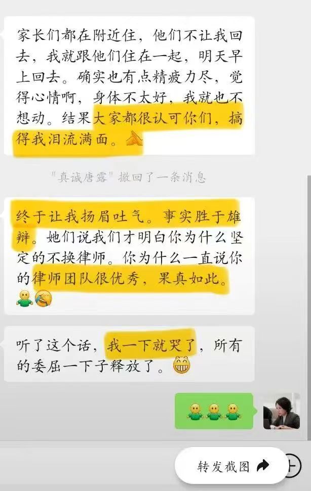 庭后,当事人及家属纷纷发来感谢,多位家属表示:“一开始很担心,结果律师一点不输他人,专业代表一切”“刘主任气场十足,办事效率高、执行力强”“终于明白为什么坚定不换律师,事实胜于雄辩”。当事人更是激动落泪,坦言所有委屈得以释放,由衷为律师团队的优秀与负责点赞。