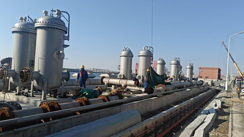 盘锦港309#-314#液体散货泊位工程8台航煤过滤器进场,设备安装进入收尾冲刺