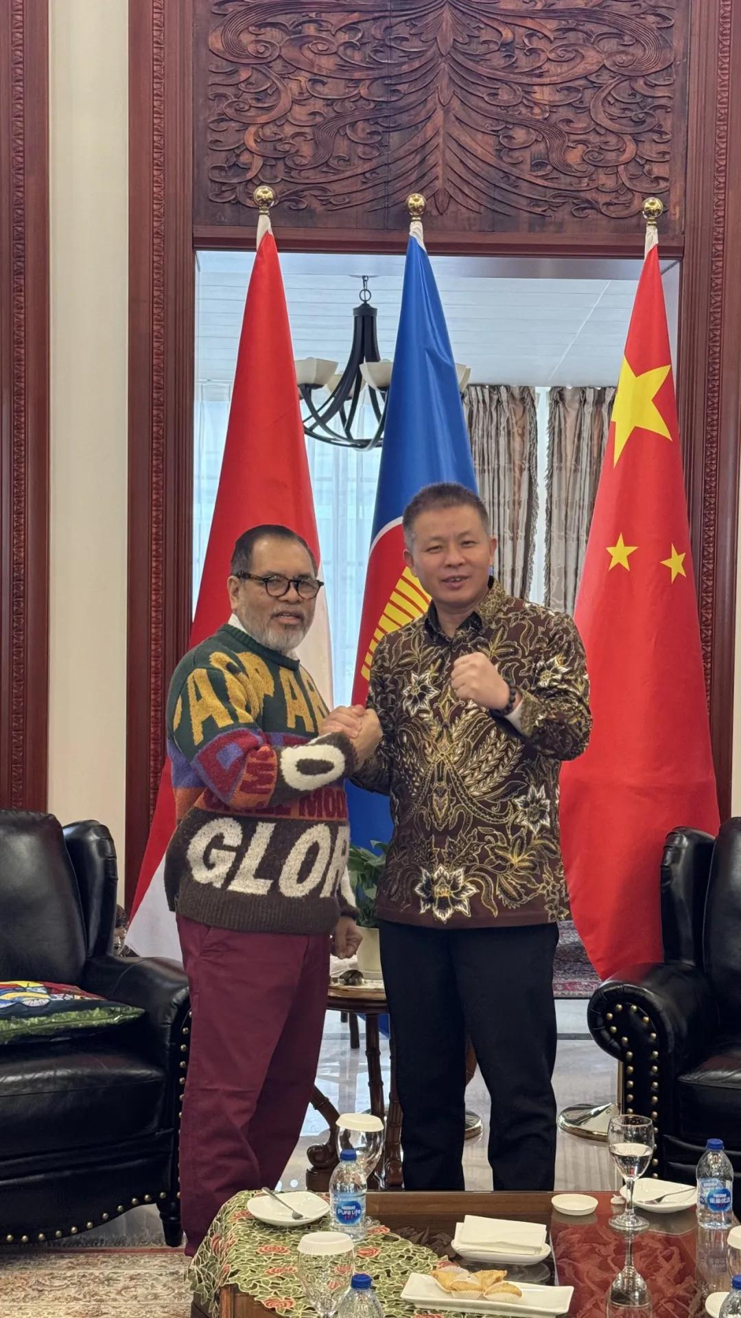 印尼驻华大使 H.E. Djauhari Oratmangun 阁下携副大使 Irene、经济参赞 Dita、投资参赞 Rizaldi、政治处 Dewi、顾问 Lebit 等使馆核心成员共同参与会见。双方围绕中印尼在经贸、投资与产业合作等领域的发展机遇展开了务实而深入的对话,并就加强政策沟通、优化投资环境、促进重点项目对接等方面提出了具有建设性的意见与建议。