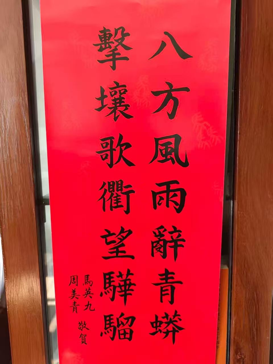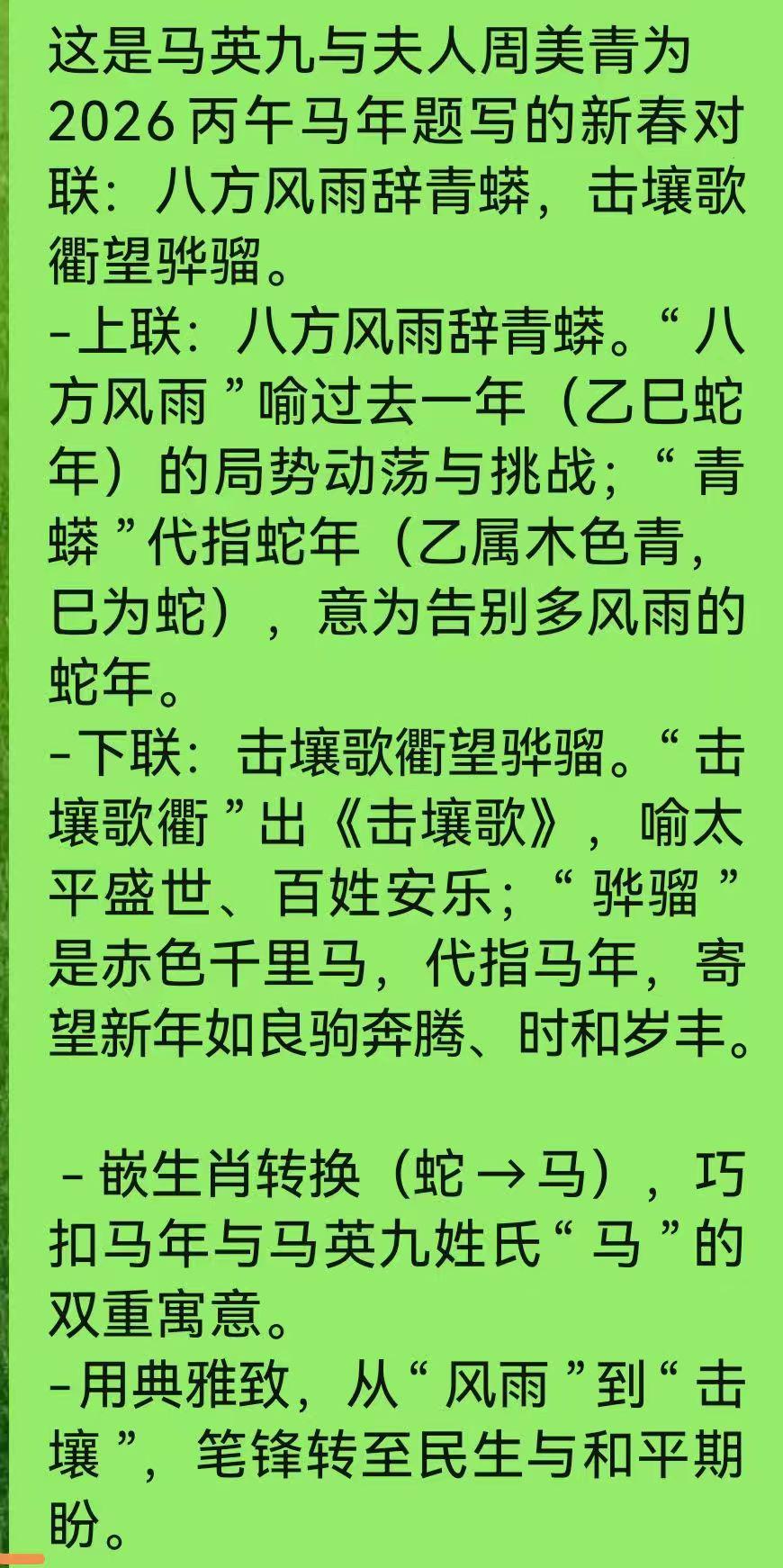 据介绍,上联“八方风雨辞青蟒”中,“八方风雨”寓意过去乙巳蛇年的局势动荡与挑战;“青蟒”则以乙木属青、巳为蛇,代指蛇年,表达辞旧迎新的愿望。下联“击壤歌衢望骅骝”用典《击壤歌》,象征太平盛世、百姓安乐;“骅骝”指赤色千里马,既紧扣丙午马年生肖转换,也寓意良驹奋蹄、时和岁丰,更巧妙呼应“马”姓之意,寄托对新岁和平与发展的期盼。