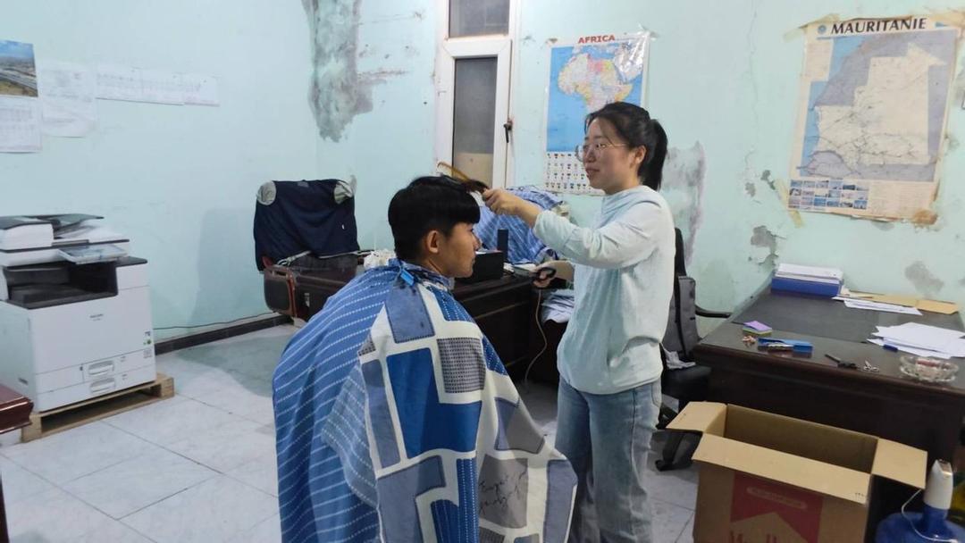 理发师一边耐心询问发型需求,一边与大家唠家常,现场气氛轻松愉悦。“没想到在撒哈拉沙漠还能享受到这么贴心的服务,剪完头发整个人都精神了!”刚理完发的职工小王对着镜子满意地说道。一上午时间,先后有20余名职工“焕然一新”。