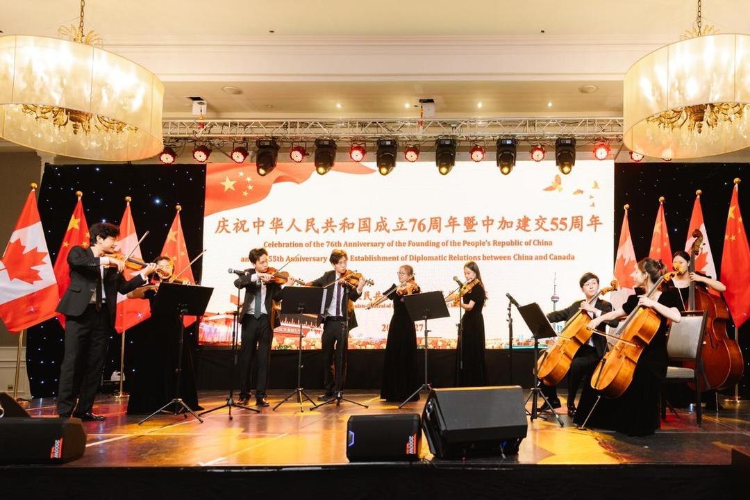 9月27日晚,中国音乐学院附中九名学生和中国音乐学院教授高鹏、窦群芳在中国驻多伦多总领事馆庆祝中华人民共和国成立76周年暨中加建交55周年招待会上献演,带来弦乐九重奏《紫竹调》《茉莉花》《红河谷》和二重唱《我爱你中国》。