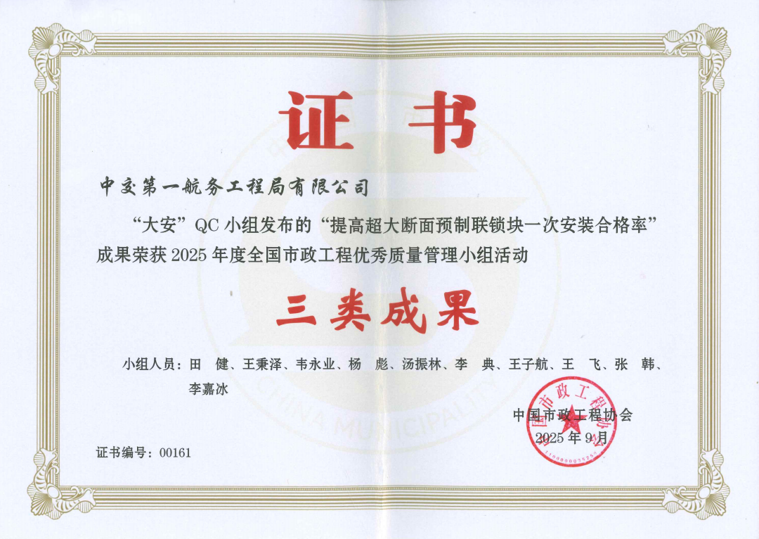共工新闻社12月13日电(通讯员:刘忠壮)近日,中交一航局四公司大安项目部“QC小组”《提高超大断面预制连锁块一次安装合格率》解决型课题成果,荣获中国市政工程协会优秀QC成果大赛Ⅲ类成果。
