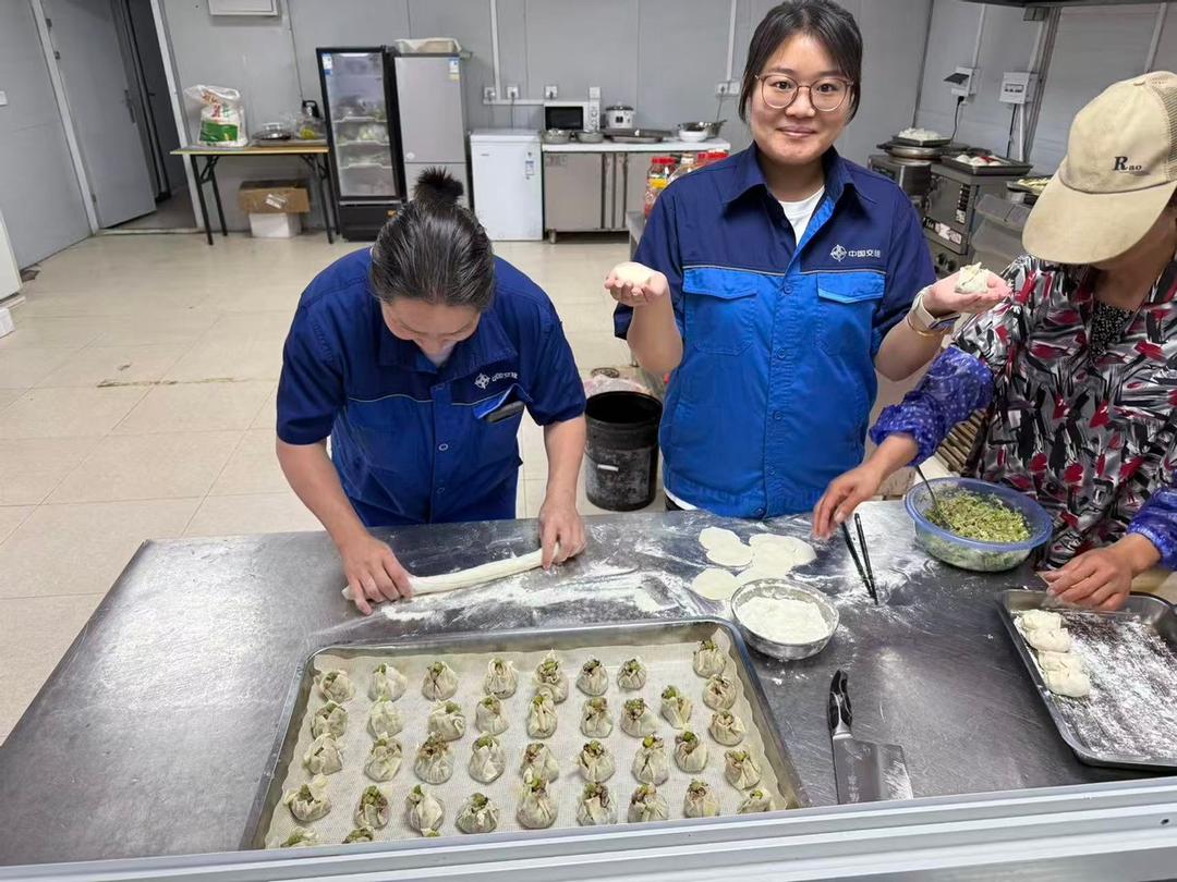项目部活动室里,喝彩声此起彼伏。乒乓球女单决赛正在激烈上演。挥拍、扣杀、旋球,每一个动作都尽显专业与活力。赛场边,观赛的同事们围成一圈,时而屏息凝神,时而欢呼雀跃,加油声、鼓掌声交织在一起,汇成了欢快的乐章。赛场之外,食堂里也是一派热闹景象。和面、擀皮、调馅、包饺子、捏烧麦,大家分工协作,忙得不亦乐乎。看着自己亲手包出的成果,大家脸上都洋溢着幸福的笑容。