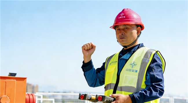 鲁工目光专注锁定信号,随即缓缓抬起单手,稳稳攥拳举至胸前,这个简洁有力的动作,既是对安全反馈的明确回应,更是启动龙门吊的指令信号。握拳的瞬间,凝聚着对安全的敬畏与坚守,也拉开了架梁作业的序幕,让每一次启动都扎实可靠,确保作业在安全的前提下高效推进。